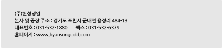 상호명: (주)현성냉열 대표자 : 한성호 사업자등록번호: 132-86-25336 본사/공장 : 경기도 포천시 군내면 용정리 484-13